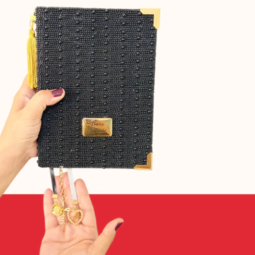 O diferencial está nos detalhes: uma guarda personalizada que adiciona um toque único e exclusivo, além de pingentes folheados a ouro que trazem simbolismo e brilho à sua experiência de leitura. Complementando o acabamento, contamos com uma sofisticada placa metálica personalizada, que destaca sua Bíblia como um objeto de valor e devoção.