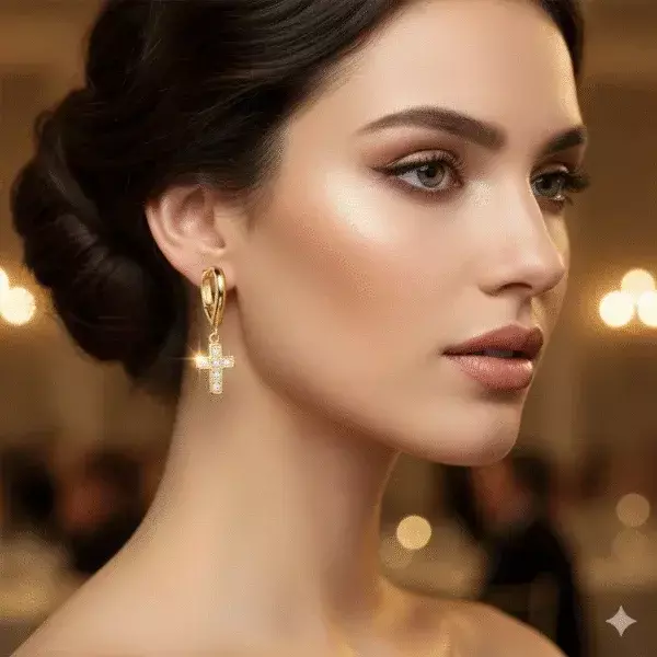 Linda Argola Ovalada com pingente de cruz cravejada de zircônia.